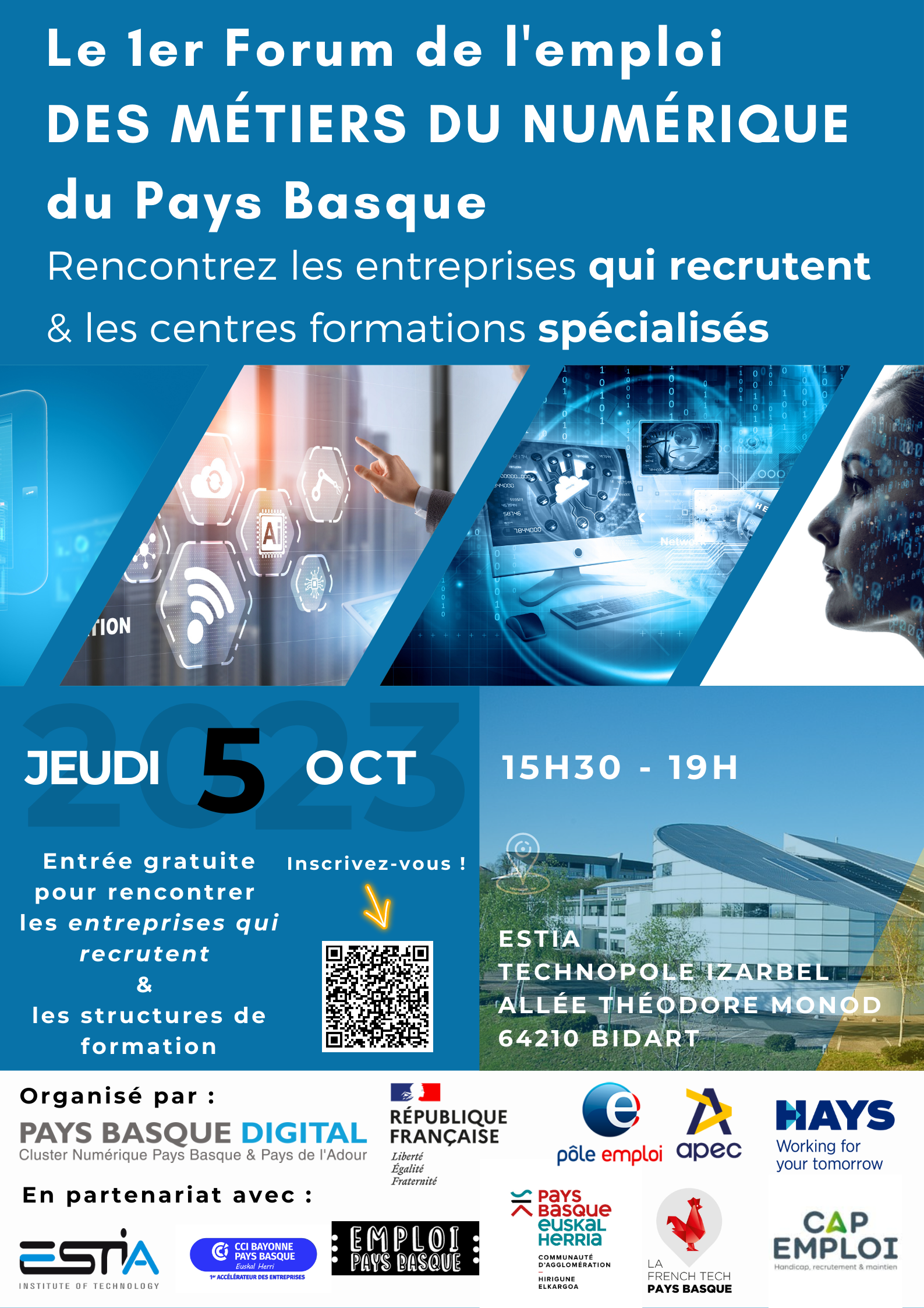 Au sein de l’école d’ingénieur ESTIA à Bidart (devant Exakis Nelite), le 5 octobre 2023 de 15h30 à 19h, rencontrez les entreprises qui recrutent des postes dans le numérique et les centres de formations spécialisés !